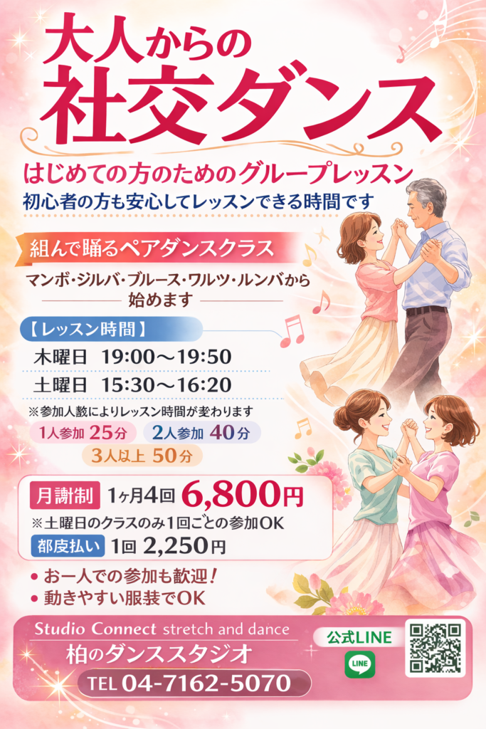その上で、音楽に合わせた社交ダンスを楽しむことで、無理なく有酸素運動ができます。