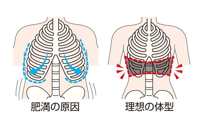 - 腹筋や体幹が弱い 胸郭を内側に引き締める力が弱く、肋骨が自然に広がる。