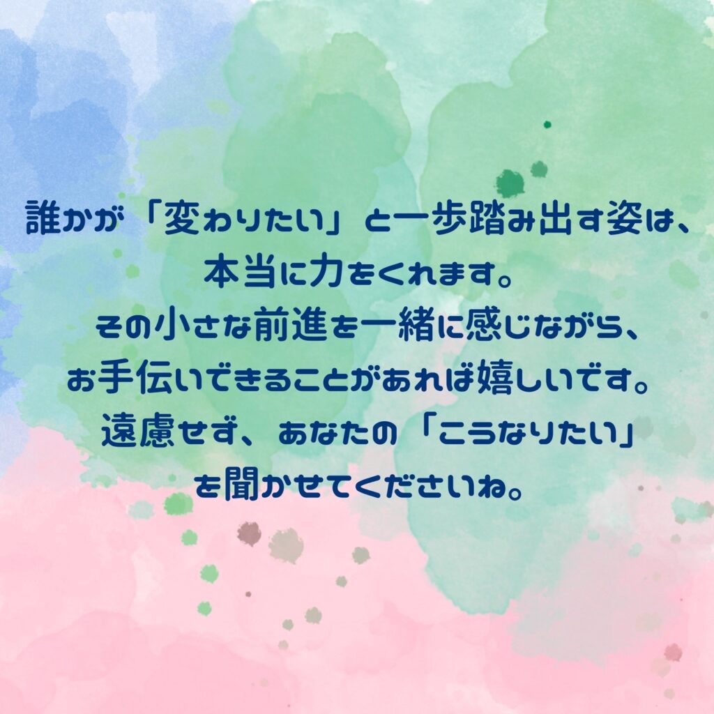 【前に進もうとする気持ちを応援したい】 ストレッチ 2025.12.08 頑張ろうとしている人って、自然と応援したくなりますよね。 私は、スタジオに来てくれる一人ひとりのことを大事にしたいと思っています。その人が前に進もうとする気持ちや、小さな一歩一歩もしっかり感じ取りたいんです。 もちろん、すべてを感じられるわけではありません。でも、それでも目の前の人の変化や努力を感じながら、少しでもサポートできたら嬉しいと思っています。 「こうなりたい」と宣言してくれるのは大歓迎です。宣言してもらえると、サポートもしやすくなりますから。遠慮せず、ぜひ聞かせてくださいね。