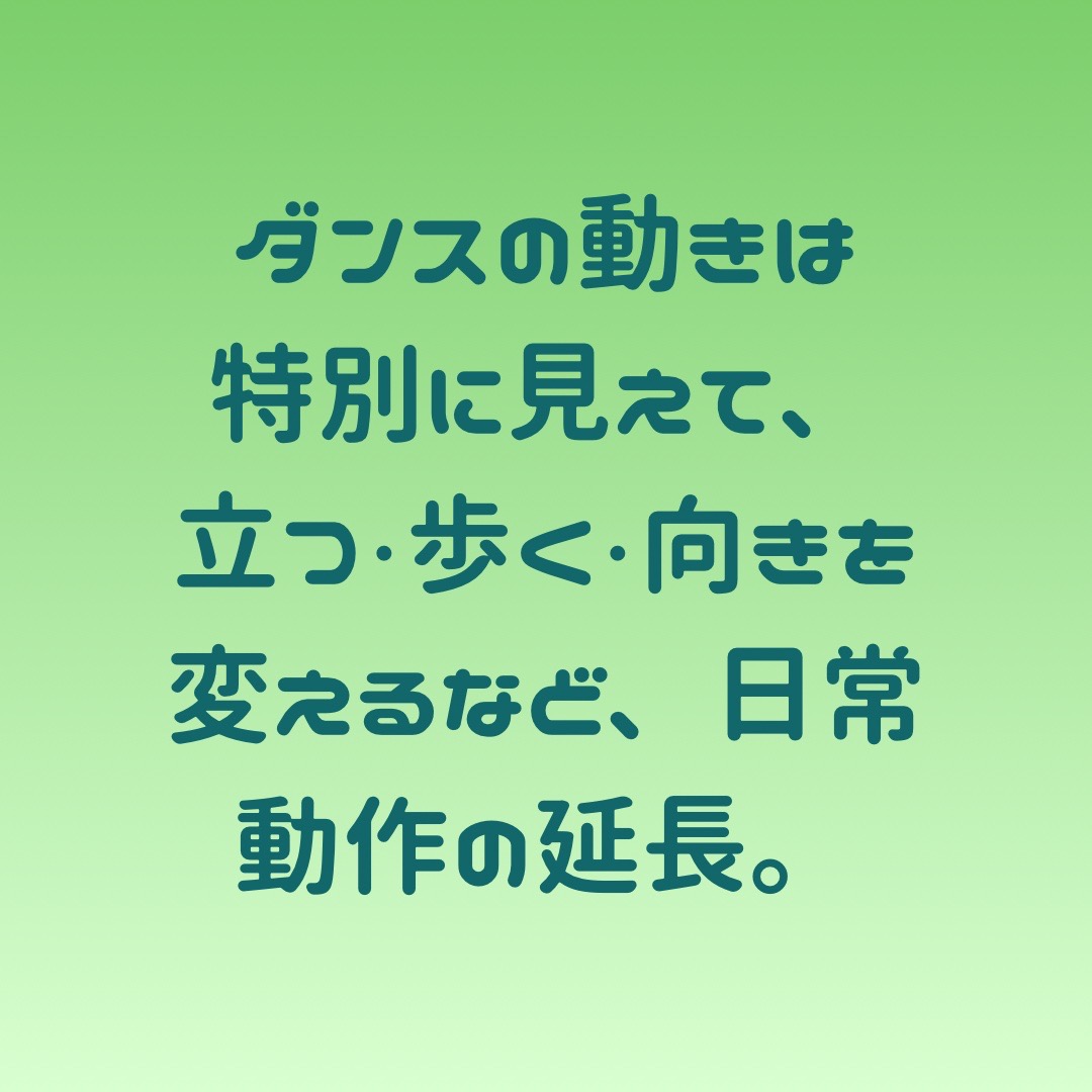 【ダンスの動きが日常を変える理由】 ダンス 2025.12.20 「歩きやすくなった」 「疲れにくくなった」 これはダンスを続ける方からよく聞く言葉です。 ダンスの動きは特別に見えて、 実は立つ・歩く・向きを変えるなど、 日常動作の延長。 からだの使い方が整うと、 日常の動きが楽になります。 ダンスは踊っている時間だけのものではありません。 日常の一歩一歩を、変えてくれる時間です。