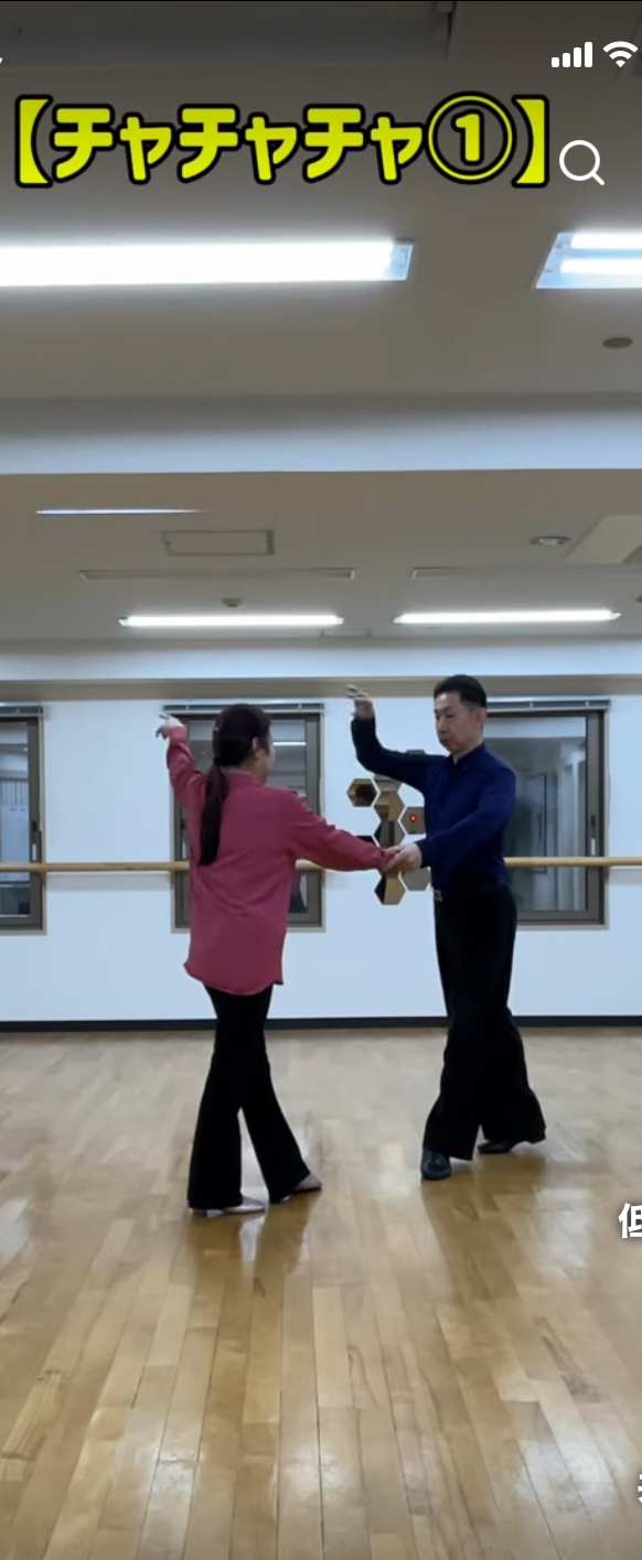 【チャチャチャ①】 ダンス 2026.01.06 予備歩からオープン・ヒップ・ツイスト 4&1 234&1 234&1 ルンバのオープン・ヒップ・ツイストと同様、男性の前で女性がヒップ・ツイストをするステップです。