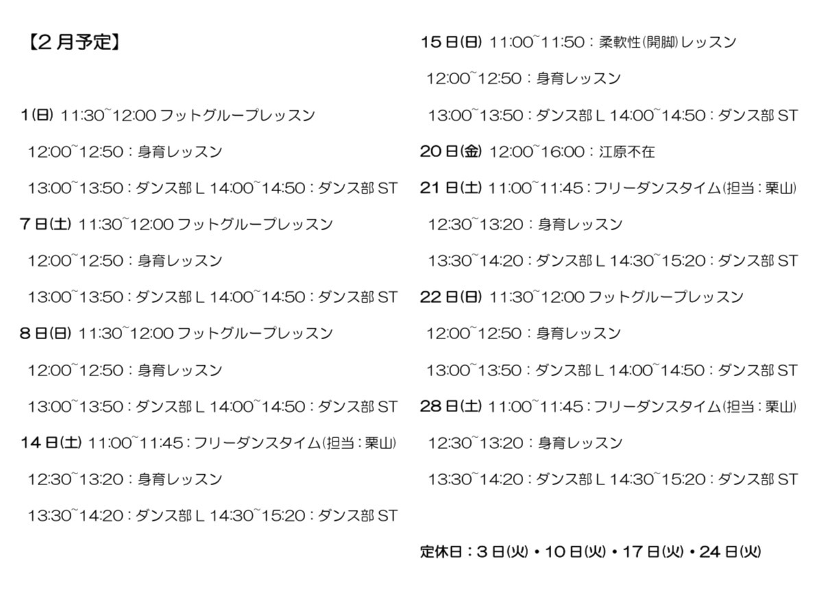 ・2月の予定から月謝制のダンスレッスンは記していません。スタジオに貼ってあるダンスレッスンスケジュールをご確認ください。