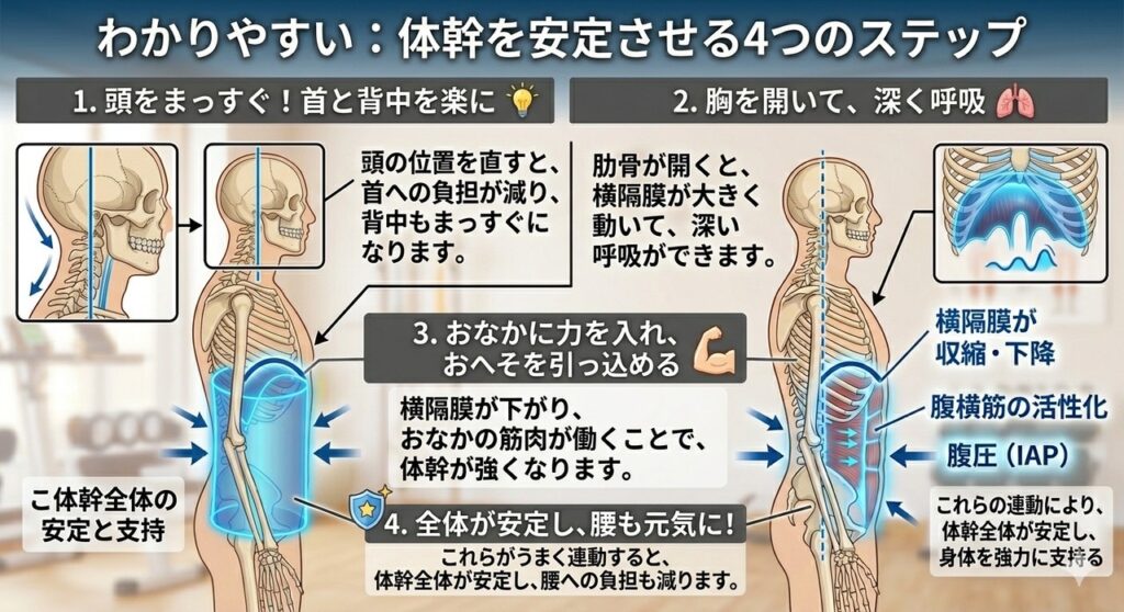 その結果、特別に力を入れようとしなくても、お腹まわりが自然と働きやすくなります。